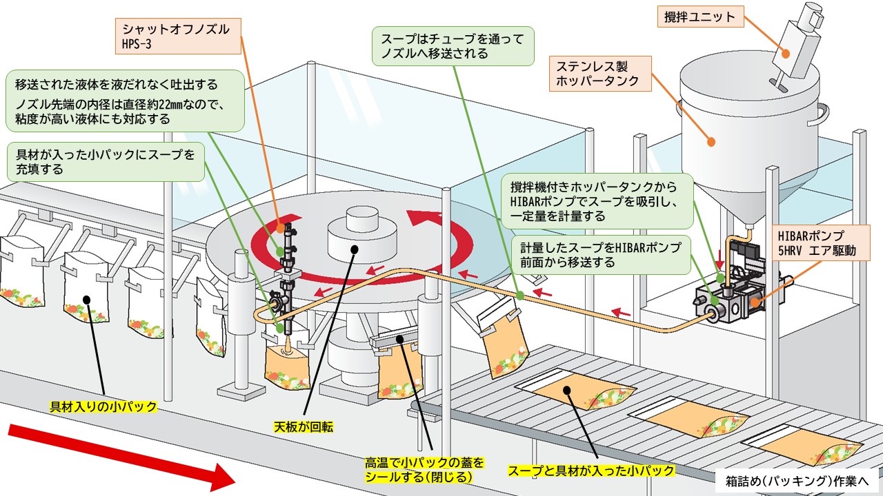 具材を小パックに投入後、スープを高精度で定量充填しています。(ハイバーポンプを使用)