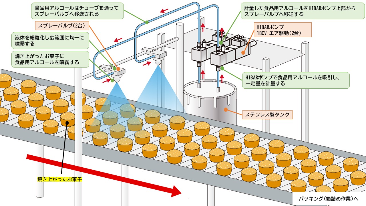 コンベアから流れてくる焼き上がったお菓子に、高速且つ適量で食品用アルコールを噴霧しています。スプレーバルブへ液体を移送するために、ハイバーポンプを使用しています。